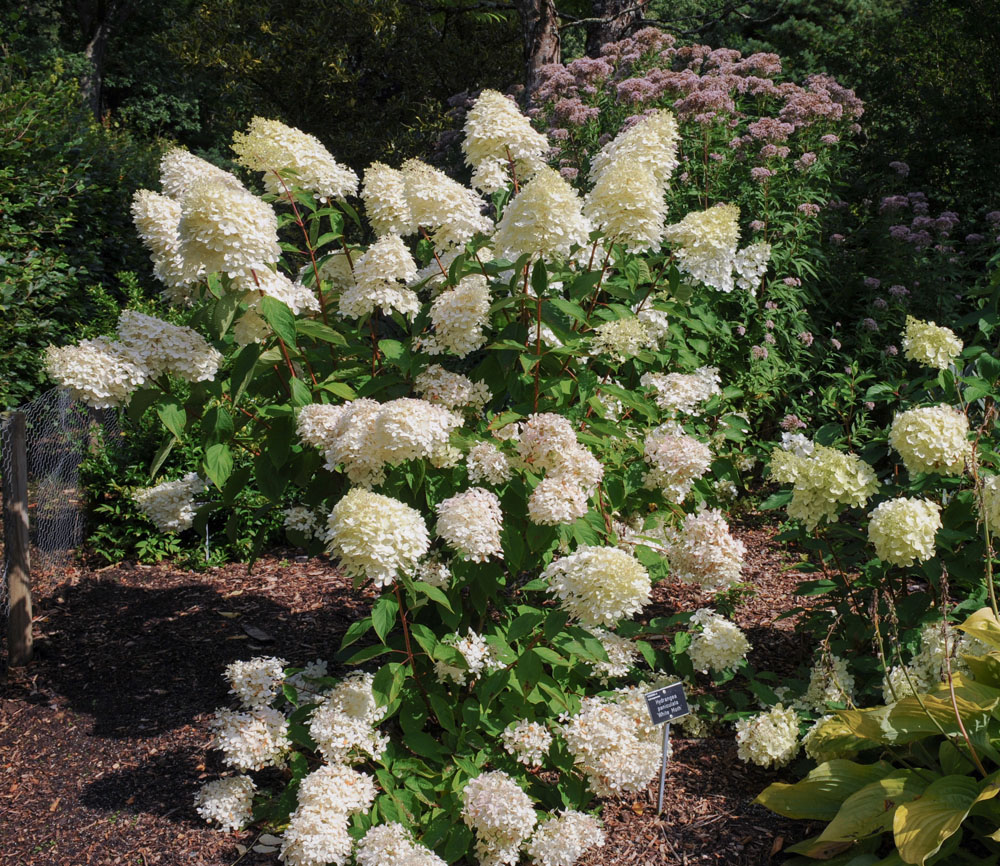 H. paniculata ‘White Moth’ – Panicle Hydrangea – bears spherical flowerheads with large sterile flowers attractive over a long period in the fall.