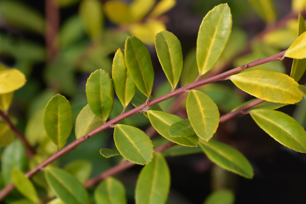 I. crenata ‘Golden Gem’ – Japanese Holly – This low growing, female, evergreen shrub, from Russia, Japan and Korea grows 3 1/2′ feet tall and 4-5′ feet wide. From irregularly branching it carries golden yellow, elliptic leaves, to 3/4″ long, turning yellow-green in summer. It is shy flowering and black fruit, to 1/4″ across. grow in full sun