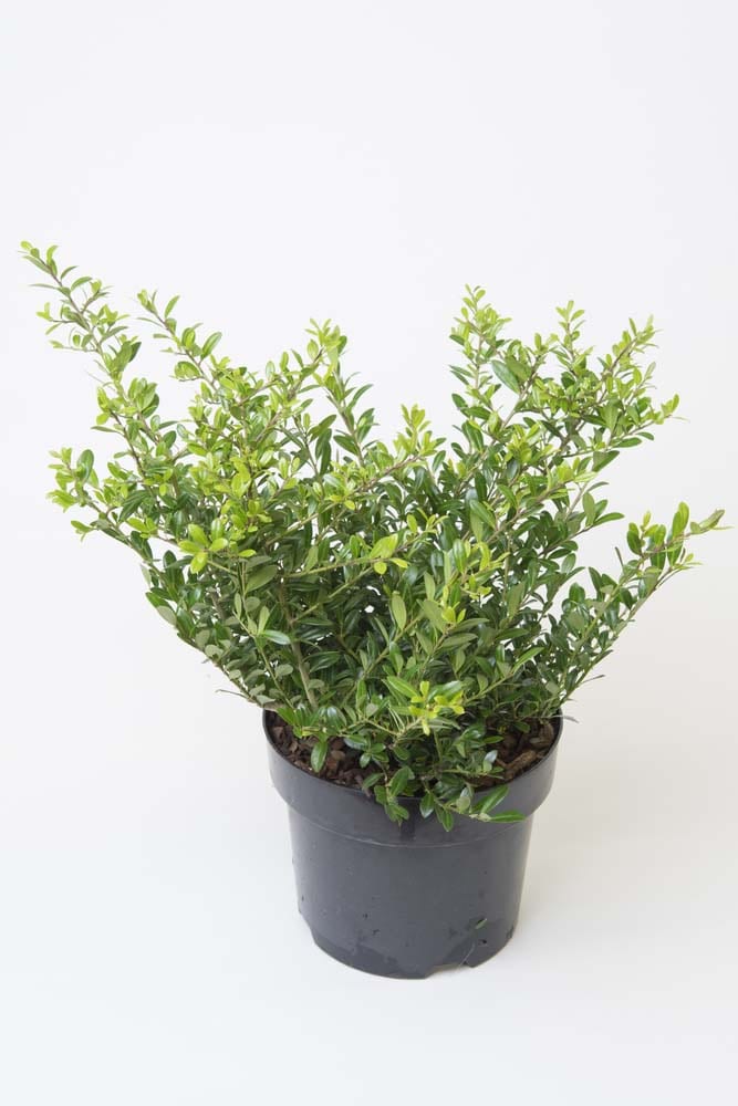 I. crenata ‘Green Lustre’ – Japanese Holly – This frost hardy, male, evergreen, compact shrub, from Russia, Japan and Korea grows 15′ feet tall and 12′ feet wide. It produces ovate to elliptic, minutely scalloped, glossy, dark green leaves, to 1 1/4″ long, often pitted beneath. It bears dull white flowers. Does not produce fruit