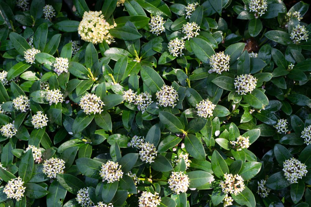 S. japonica – Japanese Skimma –This dome shaped to erect or creeping shrub from China, Japan, and Southeastern Asia grows 20′ feet tall and wide. It produces, oval, leathery, slightly aromatic, dark green leaves, to 4″ long. In mid and late spring it bears, slightly fragrant white flowers, 1/4″ across, sometimes tinged pink or red, often opening from red buds, in dense panicles, to 3″ long. Flowers are flowed on female plants by globular, red fruit, 3/8″ across. Both male and female plants are needed to obtain fruit.