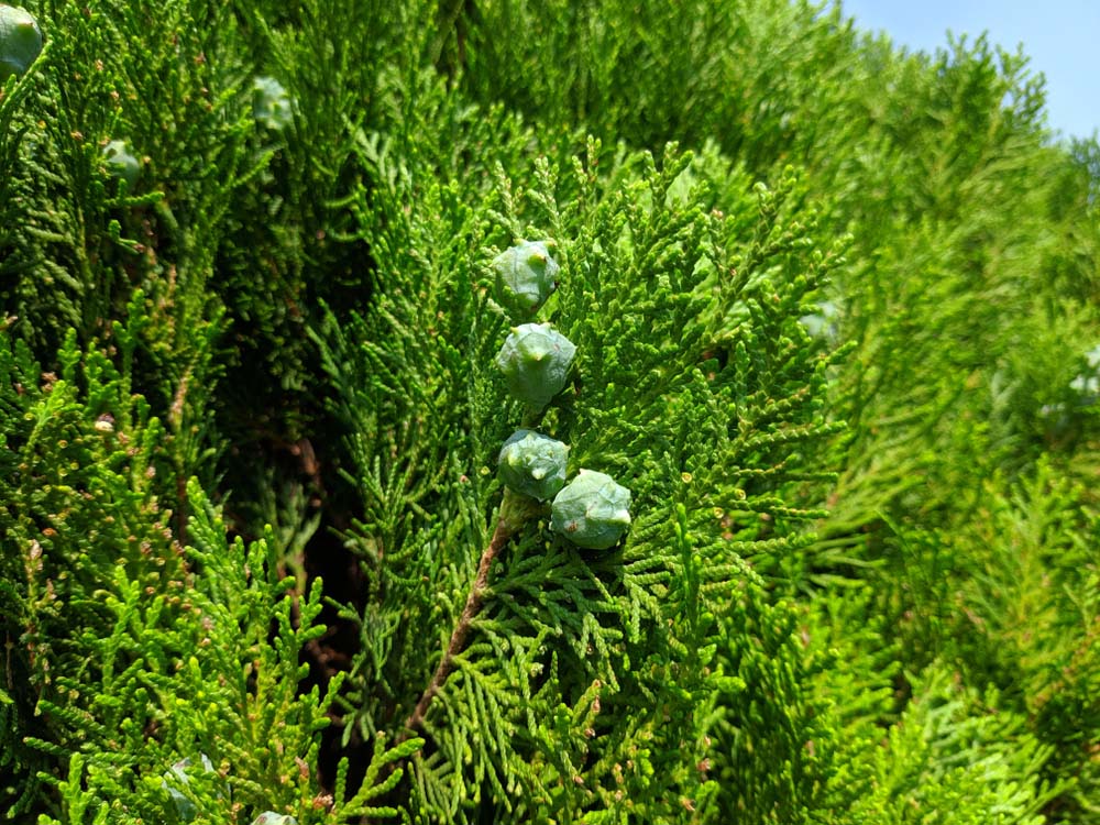 J. virginiana ‘Robusta Green’ – J. Chinensis ‘Robusta Green’ – Eastern Red Cedar – Pencil Cedar – Red Cedar – This columnar tree from Central and Eastern North America grows 15-25’ feet tall and wide. It has brown bark with narrow, spiral ridges, peeling in shreds. Both the narrowly wedge shaped,. Sharply pointed juvenile leaves and the the diamond shaped, scale like adult leaves are blue-green, carried in pairs on the same shoots. It produces ovoid, glaucous, brown-violet fruit ripen in the first autumn. Wood is used in making lead pencil hence the common name.