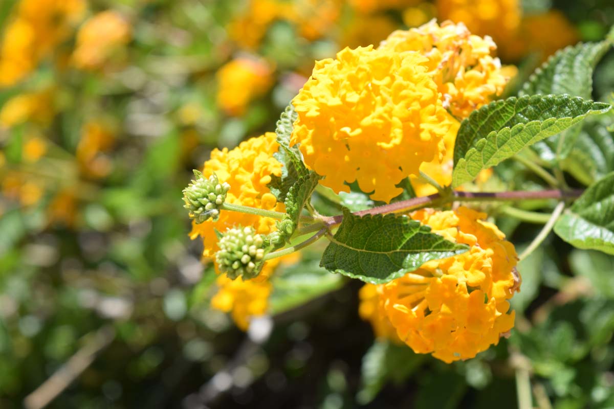 Lantana camara varia – Lantana aculeata f. varia – bears yellow flowers turning purple on the outside, orange inside.