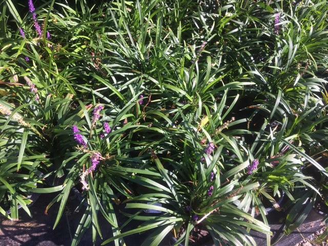 L. muscari – L. graminifolia var. densifllora – L. platyphylla – Big Blue Lilyturf – This tick, clumping tufted, evergreen, tuberous perennial from China, Taiwan and Japan grows 12-24″ tall and 18″ wide. It produces linear to strap shaped, shining dark green leaves, 10-18″ long. From early to late autumn from purple-green stems it carries dense spikes of bright violet-mauve bell shaped flowers, to 3/8″ across.