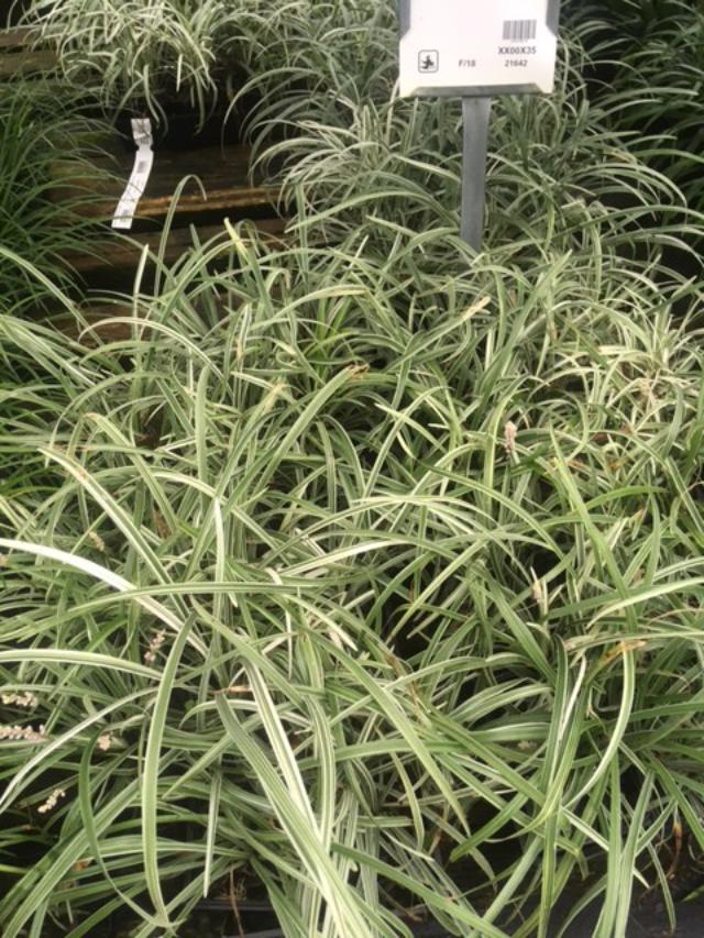 L. muscari ‘Silver Dragon’ – L. graminifolia var. densifllora – L. platyphylla – Big Blue Lilyturf – This tick, clumping tufted, evergreen, tuberous perennial grows 12-24″ tall and 18″ wide. It produces linear to strap shaped, silver and white leaves, 10-18″ long. From early to late autumn from purple-green stems it carries dense spikes of bright violet-mauve bell shaped flowers, to 3/8″ across.