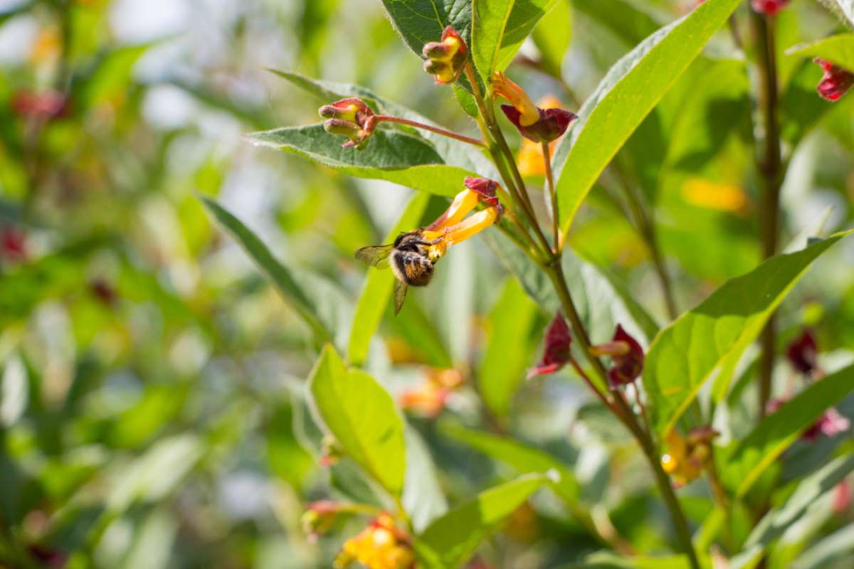 L. involucrata – Twinberry – This dense bushy, deciduous shrub from Western North America and Mexico grows 3-6′ feet tall and 10′ feet wide. From thick shoots it carries paired, ovate to oblong or lance shaped, bright mid green leaves to 5″ long, with a coating of fine hairs. In late spring it bears tubular, dark yellow, often red suffused flowers, ½” long, each with 5 short lobes, are held in pairs and are surrounded by large green bracts that soon turn red, and are followed by rounded, glossy, deep purple berries backed by large purple-red bracts.
