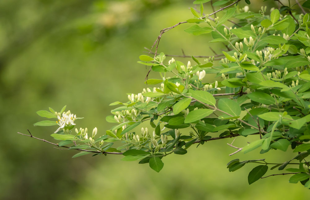 L. morrowii – This spreading, deciduous shrub from Japan grows 6′ feet tall and 6-10′ feet wide. From arching branches it carries paired, oblong or elliptic, dull mid green leaves, to 2 ½” long with fine hairs on their undersides and are purple tinged when young. In late spring and early summer it bears pairs of tubular, creamy white flowers, ½” long, aging to yellow, each with 5 short lobes, followed by glossy, red berries.