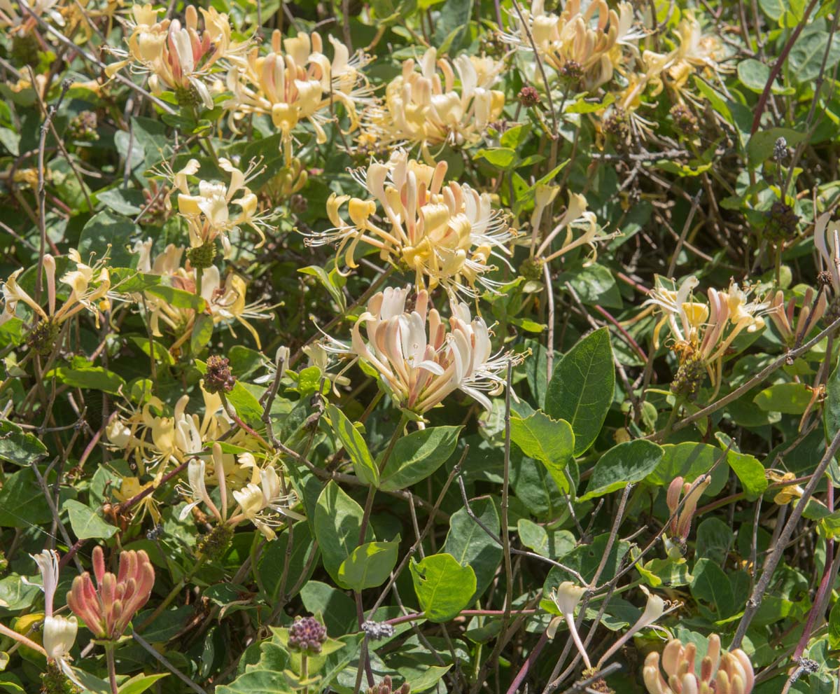 There are about 180 species of deciduous and evergreen shrubs, groundcovers, and twining climbers in this genus. They are widely distributed in the Northern Hemisphere, where they grow in varied habitats ranging from woodland and thickets to rocky places. They are grown for their tubular to funnel shaped, often sweetly fragrant flowers, which are usually 2 lipped or have 5 small, spreading lobes. The leathery leaves are held in opposite pairs, up to 6″ long and usually simple. Honey suckles may be grown in a variety of situations: train climbers on a wall or fence, or into a a large shrub or small tree, grow shrub in a shrub border, or use for hedging or as a groundcover. Some species may become invasive. The berries may cause mild stomach upset if ingested. Honeysuckles are attractive to bees and birds.