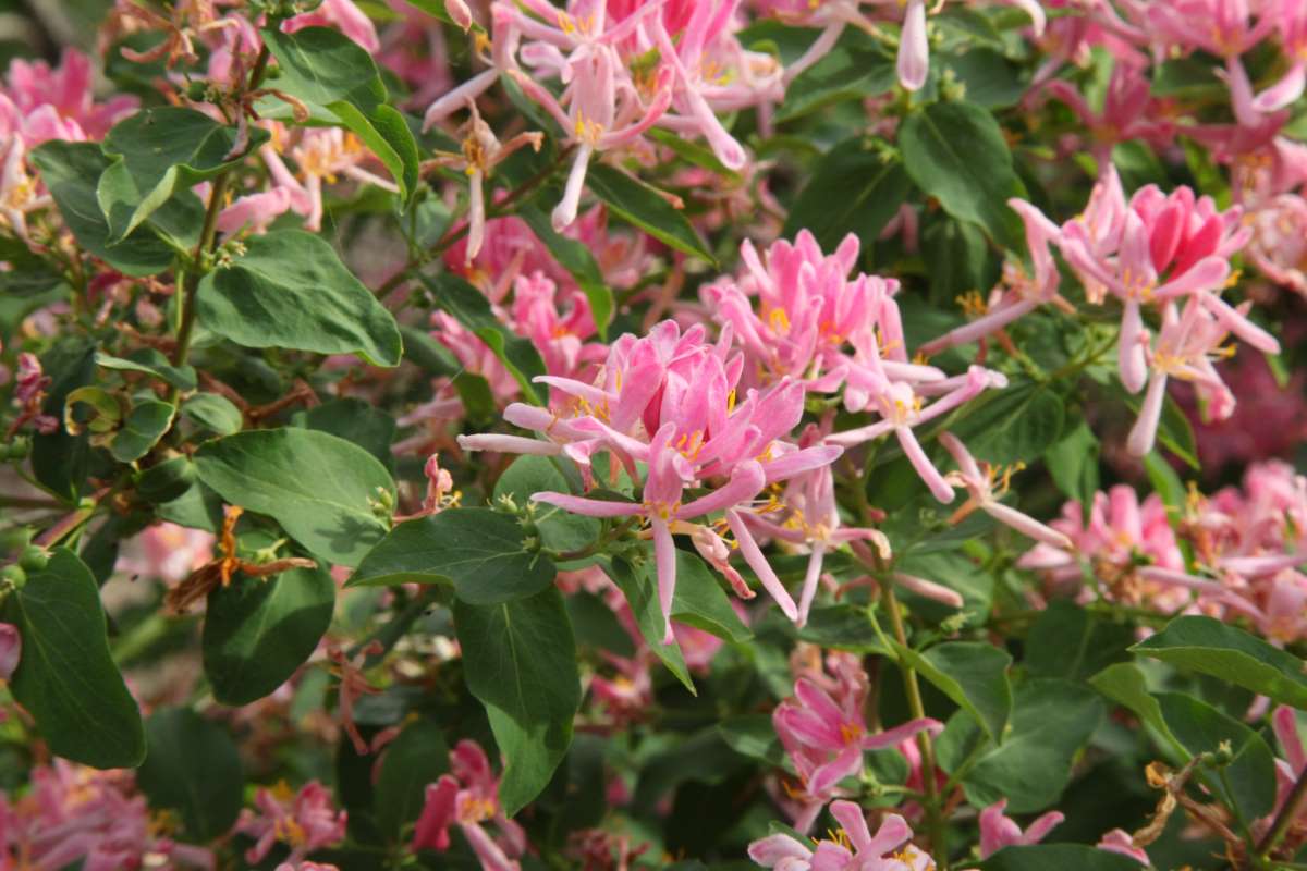 L. tatarica – Tatarian Honeysuckle – This upright, bushy, deciduous shrub found from the Caucasus to Central Asia grows 12′ feet tall and 8-10′ feet wide. It produces pairs of oblong-ovate to lance shaped, dark green leaves, to 2 ½”’ long, blue gray beneath. In late spring and early summer it bears axillary pairs of trumpet shaped, 5 lobed, white to pink or red flowers, to 1″ long and wide, followed by scarlet to yellow-orange berries. May become invasive.