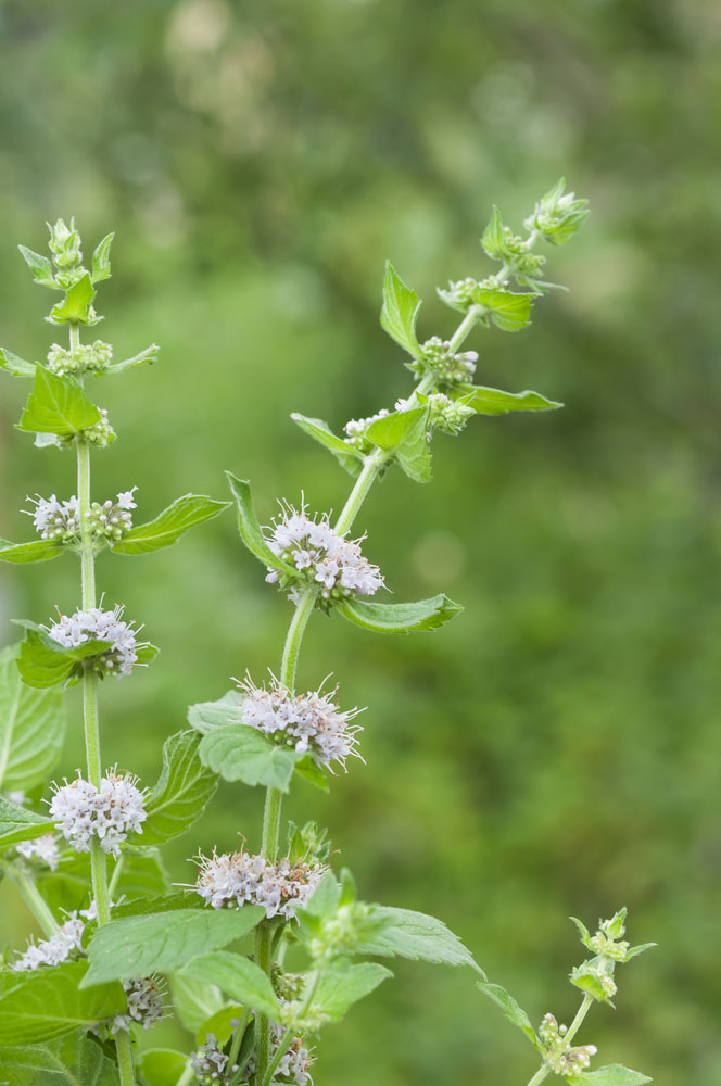 There are about 25 species of aromatic, evergreen or semi evergreen, rhizomatous perennials, rarely annuals in this genus. They are distributed in Europe, Asia, And Africa, often found in shallow water or wet or moist soil. Erect, branching stems bear lance shaped to rounded, light to dark green, purple, blue, or gray-green leaves. The tubular to bell shaped flowers are weakly 2 lipped, each with 4 spreading lobes and leafy bracts. They are borne in summer, in spikes of whorl like clusters, or occasionally in a single, terminal cluster. Mints are widely used as culinary, fragrant, medicinal and industrial herbs.