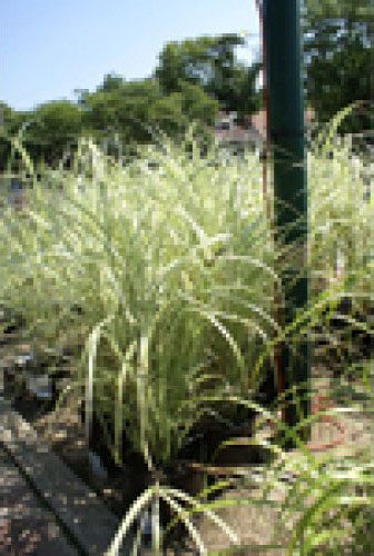 M. sinensis ‘Cosmopolitan’ – Eulalia Grass – This vigorous, deciduous, clump forming, perennial grass is one of the least invasive ornamental grasses from Southeastern Asia and is usually less then 6′ feet tall and 4′ feet wide. It produces erect stems and mostly basal, broad, flat, erect or arching, linear, blue green leaves with white stripes to 4′ feet long. In autumn it bears pyramidal panicles, to 16″ long, of silky hairy, pale gray spikelets, tinted maroon or purple-brown