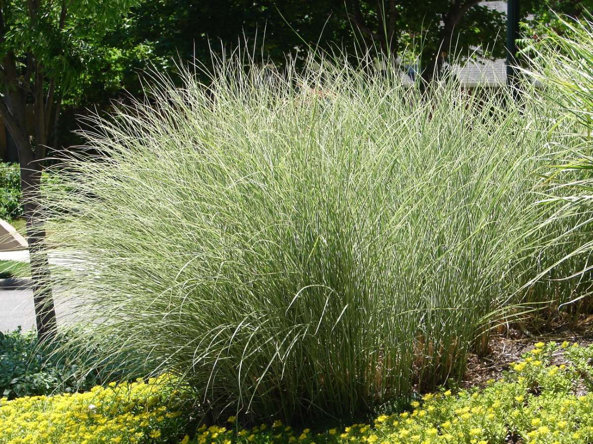 Miscanthus sinensis ‘Morning Light’ – Eulalia Grass – This vigorous, deciduous, clump forming, perennial grass is one of the least invasive ornamental grasses from Southeastern Asia and is usually less then 4′ feet tall. It produces erect stems and mostly basal, broad, curved, erect or arching, linear, blue green leaves with narrow white edges to 4′ feet long, giving a silvery effect. In autumn it bears pyramidal panicles, to 16″ long, of silky hairy, pale gray spikelets, tinted maroon or purple-brown