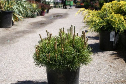 P. mugo – Mountain Pine – Mugo Pine – Dwarf Mountain Pine – Swiss Mountain Pine – This slow growing shrub or rounded to broadly spreading tree from mountains of Central Europe grows 12′ feet tall and 15′ feet wide. It has thick, ascending or spreading branches, scaly gray bark, green shoots, becoming brown, and very resinous, ovoid-oblong buds. It produces well spaced, dark to bright green leaves, 1 1/4-3″ long, are borne in pairs. It bears oval to long conical, dark brown female cones are 3/4-2 ½” long and symmetrical at maturity. Does not tolerate extreme heat or dry conditions.