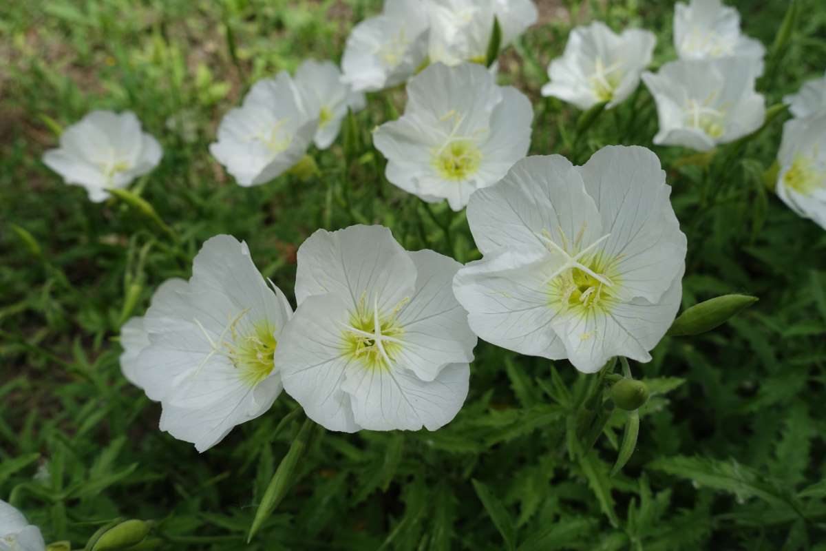 O. pallida – This spreading, rhizomatous, hairless, freely branching perennial from western North America grows 8-20″ tall and 8-12″ wide. It produces lance shaped, wavy edged mid green leaves, 1-2 ½” long. From early summer to autumn it bears saucer shaped, fragrant white flowers, 3/4-4″ across, aging to pink opening at dusk.