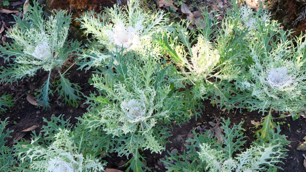 B. oleracea cultivars – These ornamental cabbage and kale are cross between wild Mediterranean and grow 12-18″ tall and wide.They form rounded loose rosettes of variously colored foliage, suitable for containers, or autumn or winter bedding. They are usually available as seed mixtures of rounded to ovate, plain or fringed, white, red, or pink leaves. The most vivid coloration is produced after temperature fall below 50 degrees Fahrenheit, yields edible roots (kohlrabi), leaves (cabbage), shoots a(brussels sprouts) and flower buds (cauliflower and broccoli).