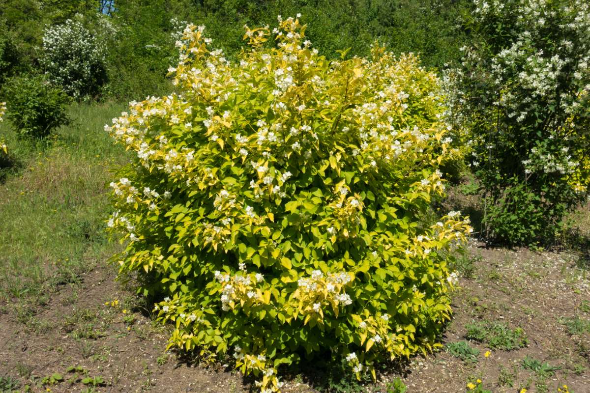 P. coronarius ‘Aureus’ – Common Mock Orange – Sweet Mock Orange – This upright, deciduous shrub grows 8′ feet tall and 5′ feet wide. It produces oval, shallowly toothed, golden yellow that turn lime green in summer. Leaves, to 4″ long with slightly hairy undersides. In early summer it bears short, terminal racemes of 5-9, cup shaped, single, very fragrant, creamy white flowers, 1-2″ across. Prefers part shade