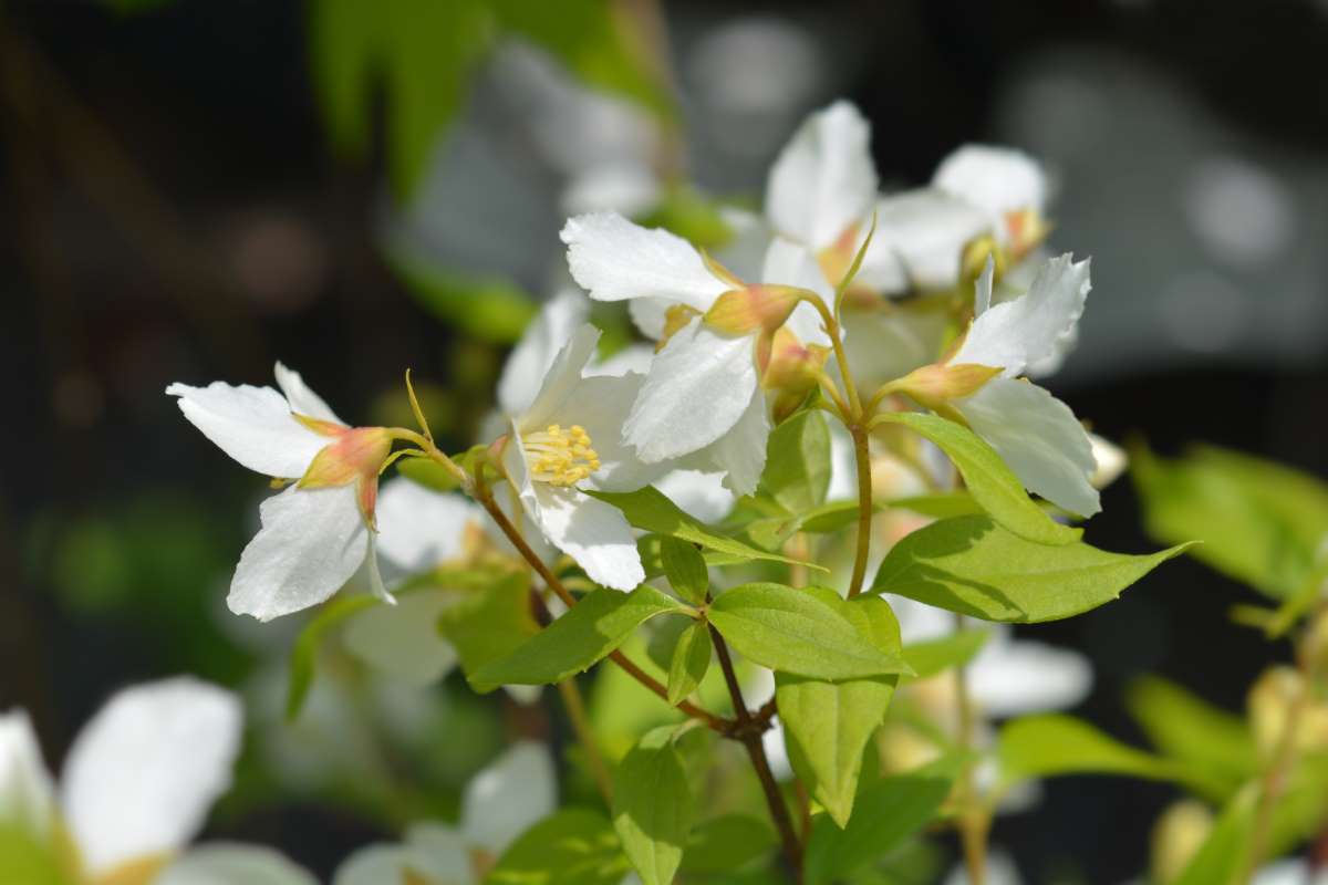 There are about 60 species of deciduous shrubs in this genus. They occur in scrub and on rocky hillsides from Eastern Europe to the Himalayas, Eastern Asia, and North and Central America. They have thin bark, flaky, finely shredding in longitude stripes. They are grown for their spring or early summer blooms of orange scented, 4 petaled, cup or bowl shaped sometimes cross shaped, single, semi double, or double flowers,, held singly or in racemes, panicles, or cymes. The leaves are simple, mostly ovate, with serrated edges, 3″ long, and mid green, arranged in opposite pairs. Grow in a shrub border, or as specimen plants in a woodland garden, larger species and cultivars may be used for screening. Grow P. mexicanus against a wall.