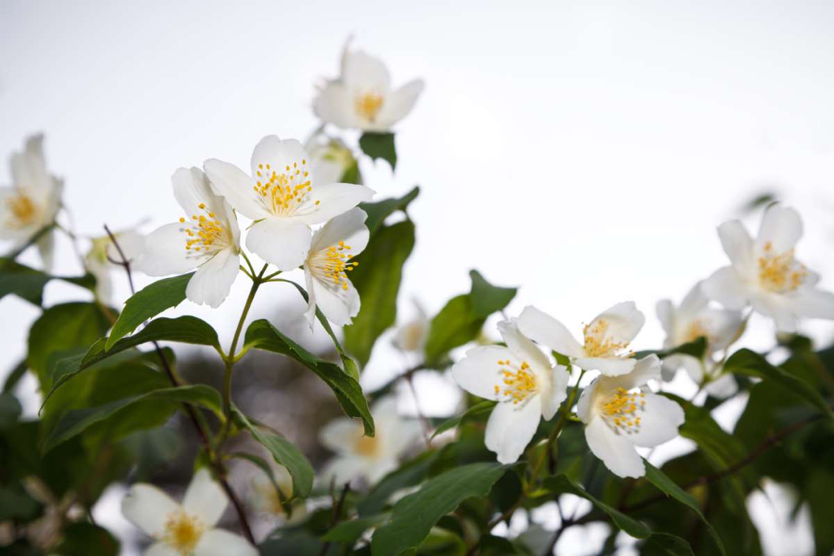 P. ‘Innocence’ – This upright, deciduous shrub grows 10′ feet tall and 6′ feet wide. From arching branches it carries ovate, smooth edged leaves, to 2″ long, strongly mottled yellow. In early summer or mid summer it bears single, sometime semi double, cup shaped, very fragrant white flowers, to 1 ½” across, held usually in 3 flowered racemes.