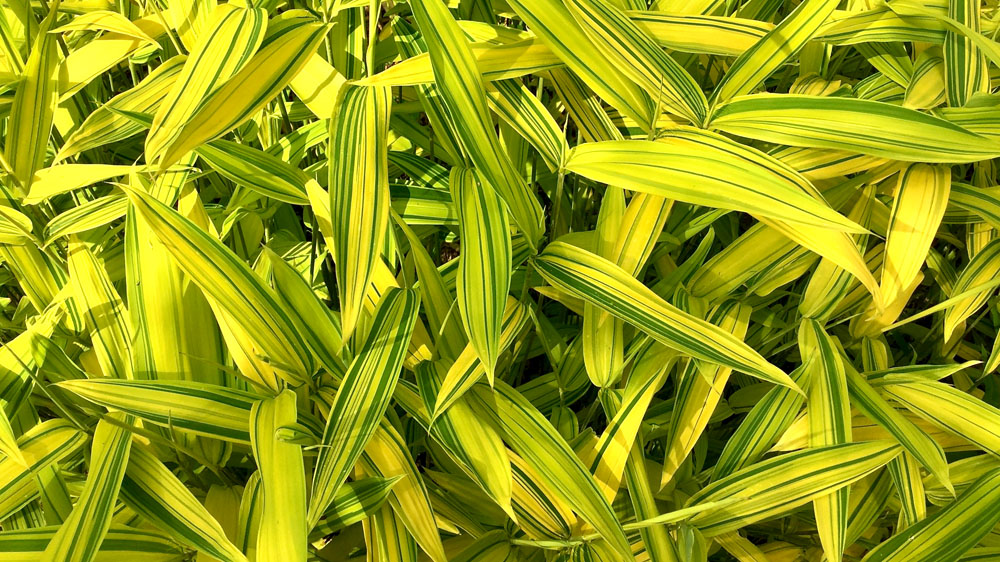 There are 75-80 medium sized to large, evergreen bamboos in the Poaceae family, in this genus. They occur in deciduous woodland and groves in Eastern Asia and the Himalayas where some can reach 100′ feet tall. They have branching habit and spreading rhizomes, although in cool temperate climates they usually form compact clumps. The culms are hollow and grooved, and often zigzag from node to node on young plants. Leaves are yellow green or light to dark green, narrowly lance shaped, and checkered.. Valued for their elegant form and foliage, some also for their subtly colored culms, they are suitable for containers outdoors, as specimen plants, or in groups among shorter shrubs in a border. They thrive in a woodland garden, and may also be used to create a screen.