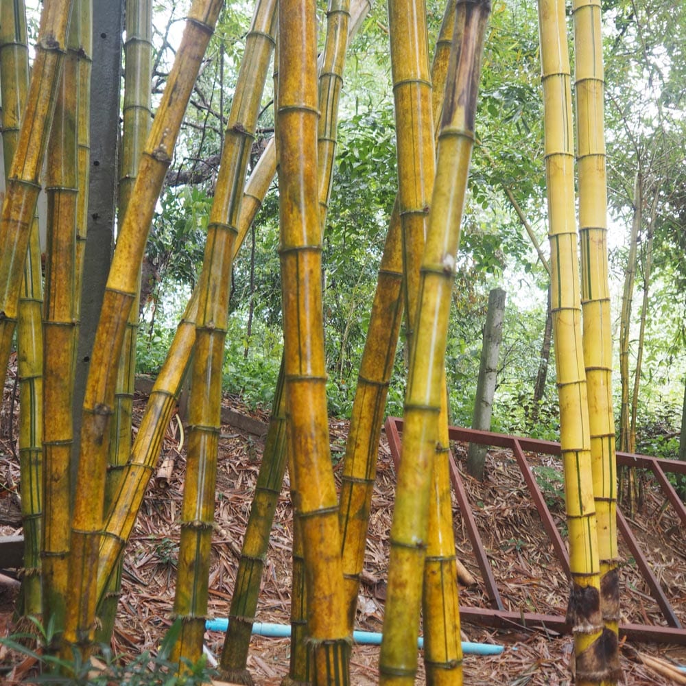 P. sulphurea – Ougon-Kou chiku – Robert Ougon-chiku – This clump forming bamboo from Eastern China grows 12-40′ feet tall with an indefinite spread. It produces upright yellow culms, which become more yellow with age, sometimes green striped, with the lower nodes pitted, hairless, and white powdery. It bears narrowly lance shaped, occasionally striped, mid green leaves, 2 ½-6″ long.