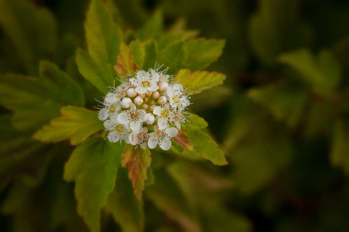 P. monogynus – Mountain Ninebark – This upright, compact shrub found from Wyoming and South Dakota to New Mexico and Texas grows 2-4′ feet tall and wide. It produces rounded to ovate, 3 to 5 lobed, doubly toothed, mid green leaves, 2″ wide. From late spring to summer it bears few rosy white flowers, 1/4″ across, in corymbs, 2″ across, followed by clusters of bladder like, green flushed red fruit, 1/4″ long.