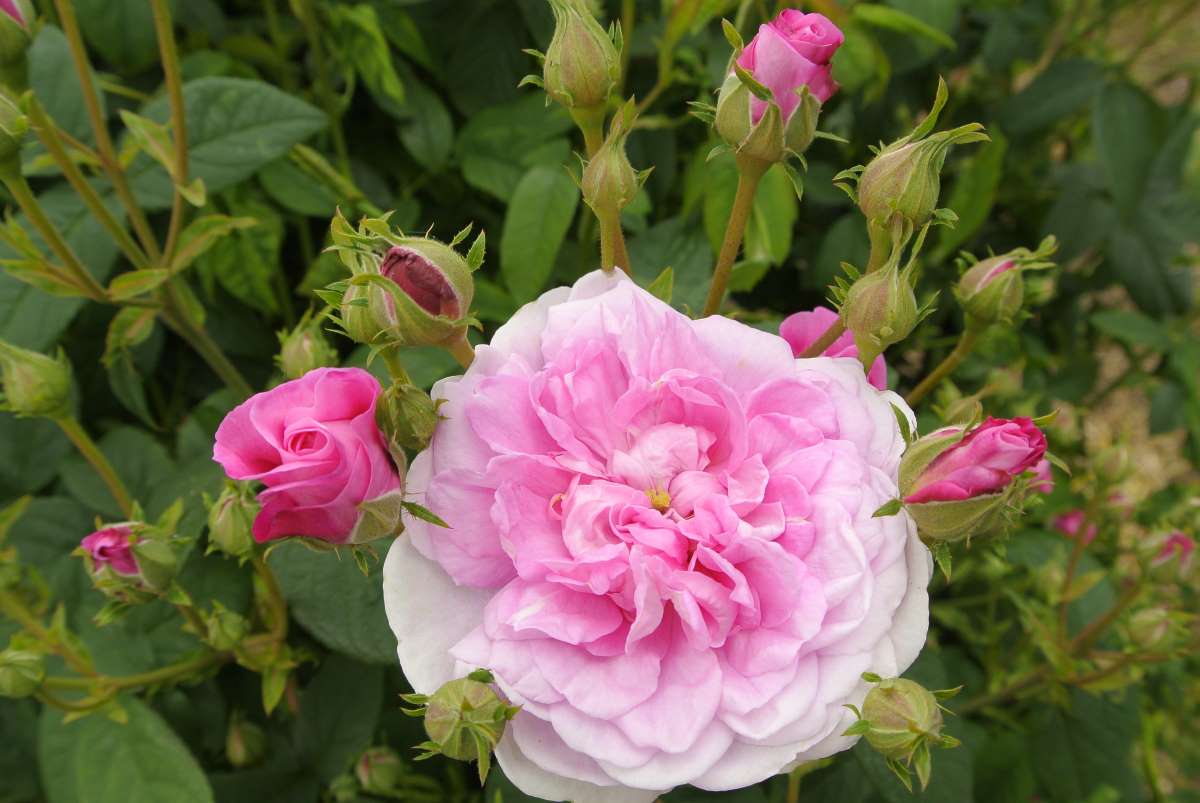Rosa ‘Ispahan’ – R. ‘Pompon des Princes’ – R. ‘Rose d’Isfahan’ – This vigorous damask rose grows 5′ feet tall and 3-4′ feet wide. It produces abundant small, glossy mid green leaves. In June for a while it bears loosely shaped buds open to cupped, double, intensely fragrant, soft mid pink flowers, that are 3″ across. Disease resistant.