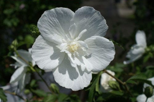 H. syriacus – Rose of Sharon – Blue Hibiscus – Shrub Althea – Syrian Hibiscus– This erect, deciduous shrub, evergreen in warmer climates is found from China to India and grows 12′ feet tall and 6-10′ feet wide. It is the hardiest of all Hibiscus. From smooth gray branches it carries ovate to diamond shaped, shallowly to palmately 3 lobed, coarsely toothed, dark green leaves, to 4″ long. From late summer to mid autumn it bears large, single or double, trumpet shaped, dark pink flowers, to 2 ½” across, with dark red centers and yellow anthered white stamen, are held singly or in pairs.