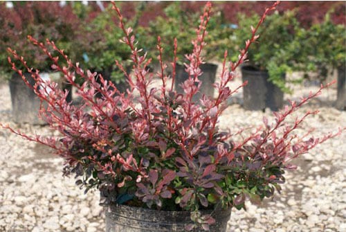 B. thunbergii – Japanese Barberry – Thunberg Barberry – This dense, low growing, rounded, deciduous shrub from Japan grows 3-5′ feet tall and 8′ feet wide. It’s spines are not particularly fierce. It produces rounded, smooth edged leaves, to 1 1/4″ long, fresh green above and bluish green beneath, turning orange and red in autumn. In mid spring it bears umbel like racemes of 2-5 bell shaped, rarely solitary, red tinged, pale yellow flowers, ½” long, followed in late summer into autumn by ellipsoid, glossy red fruit, to 3/8″ long. Excellent for hedging and urban condition and is the most widely grown.