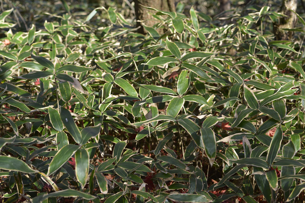 S. masumuneana ‘Albostriata’ – Sasaella masumuneana f. albostriata – This low growing, moderately spreading bamboo can grow to 5′ feet tall with an indefinite spread. It produces very slender, green or brown culms, producing a single branch at each node. The branches carry narrowly elliptic, mid green leaves, to 7″ long, are conspicuously white striped when young, becoming yellow shaded as they mature in autumn, and fading in winter.