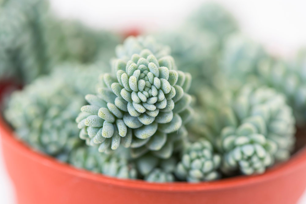 S. dasyphyllum – This mound forming, evergreen hairy perennial from the Mediterranean and Southwestern USA grows up to 4 ½” tall and 12″ wide. From many horizontal to erect, branching, pink gray stems it carries opposite or rarely alternate, overlapping, gray to glaucous, ovoid to obovoid leaves, up to 1/4″ long. In summer, bears cymes of few pink-streaked, white flowers, 1/4″ across.