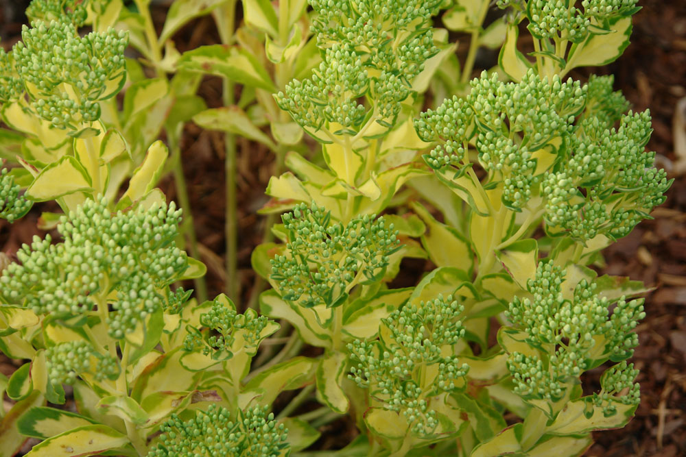 S. erythrostictum ‘Mediovariegatum – Hylotelephium roseum ‘Mediovariegatum – S. alboroseum ‘Mediovariegatum – grows 18″ wide and bears larger flowers clusters, and produces leaves with central, creamy white splashes. Grow in partial shade and cut out reverting shoots