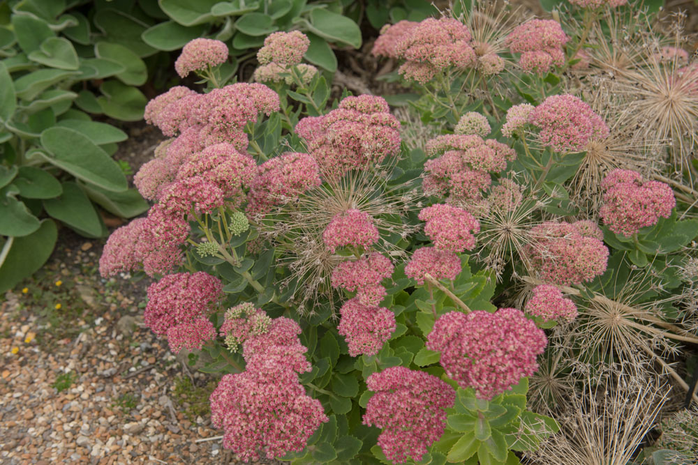 S. ‘Herbstfreude’ – S. Autumn Joy’ – Hylotelephium ‘ Autumn Joy’ – This clump forming, bushy, deciduous perennial grows 2′ feet tall and wide. From glaucous mid green stems it carries alternate, egg to oblong shaped, toothed, glaucous, ddark green leaves, to 5″ long. In early autumn, produces flat corymbs, to 8″ across, of star shaped flowers, 1/4″ across, deep pink at first, then turning pinkish bronze to eventually copper-red.