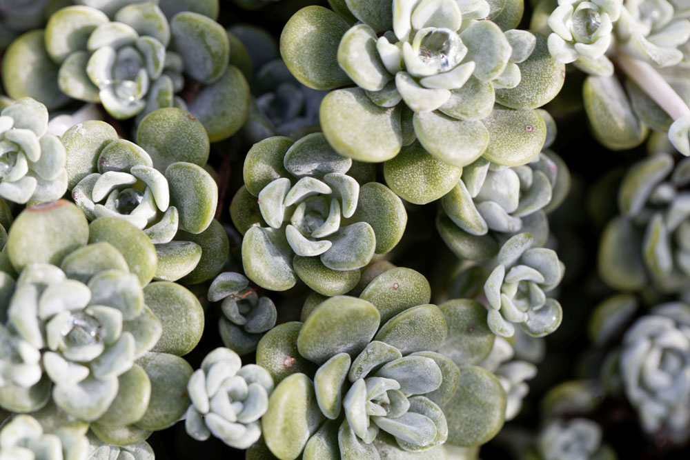 S. spathulifolium – This vigorous, carpet forming, evergreen perennial from Western North America grows 4″ tall and 24″ wide. From branching, fleshy stems it produces terminal rosettes of brittle, frosted gray-green leaves, to 3/4″ long, usually tinted bronze-purple. Short stemmed, star shaped, bright yellow flowers, ½’ across, are borne in flat cymes, 1″ across, in summer. Tolerates light shade.