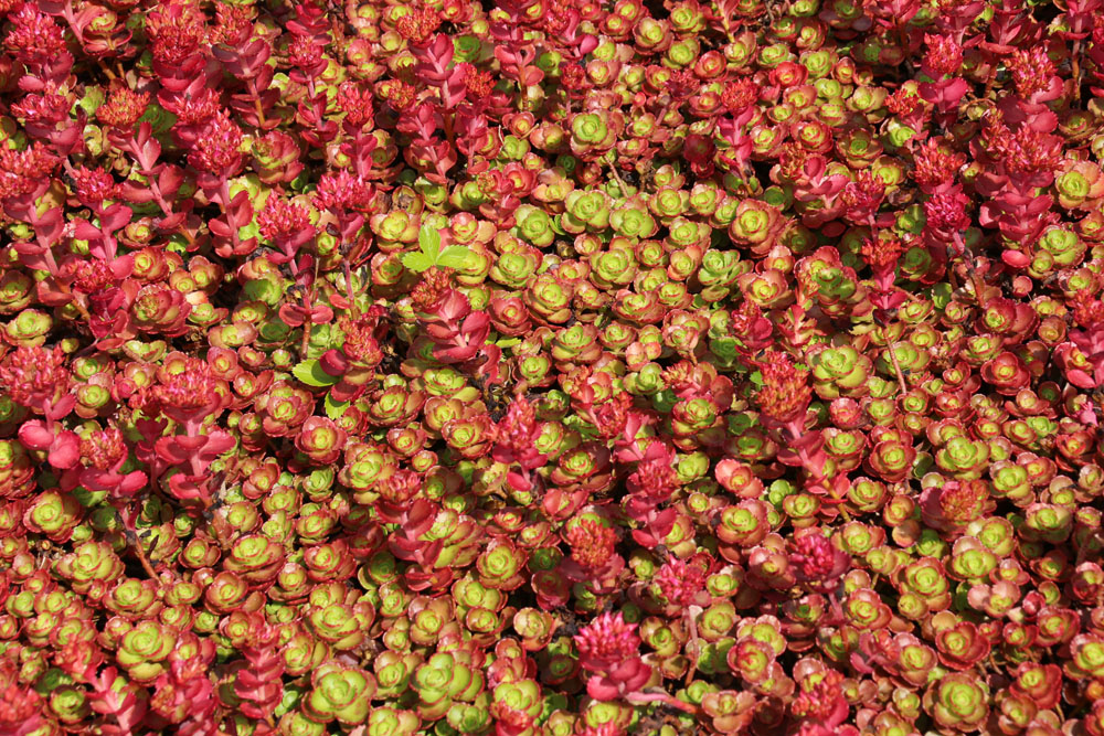 S. spurium ‘Red Carpet’ – Two-row Stonecrop – This vigorous, mat forming, evergreen perennial from the Caucasus, Armenia, Northern Iran, and Turkey grows 3-4″ tall and 24″ wide. From branching red stems it carries opposite, elliptical, saw edged, red leaves, to 1″ long. Star shaped, red flowers, 3/4″ across, are borne in rounded corymbs, 1 ½” across, from early summer to late summer.
