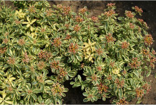 S. spurium ‘Tricolor’ – Two-row Stonecrop – This vigorous, mat forming, evergreen perennial from the Caucasus, Armenia, Northern Iran, and Turkey grows 4″ tall and 24″ wide. From branching red stems it carries opposite, elliptical, saw edged, 3 colored green, cream-white, and pink leaves, to 1″ long. Star shaped, pink flowers, 3/4″ across, are borne in rounded corymbs, 1 ½” across, from early summer to late summer.