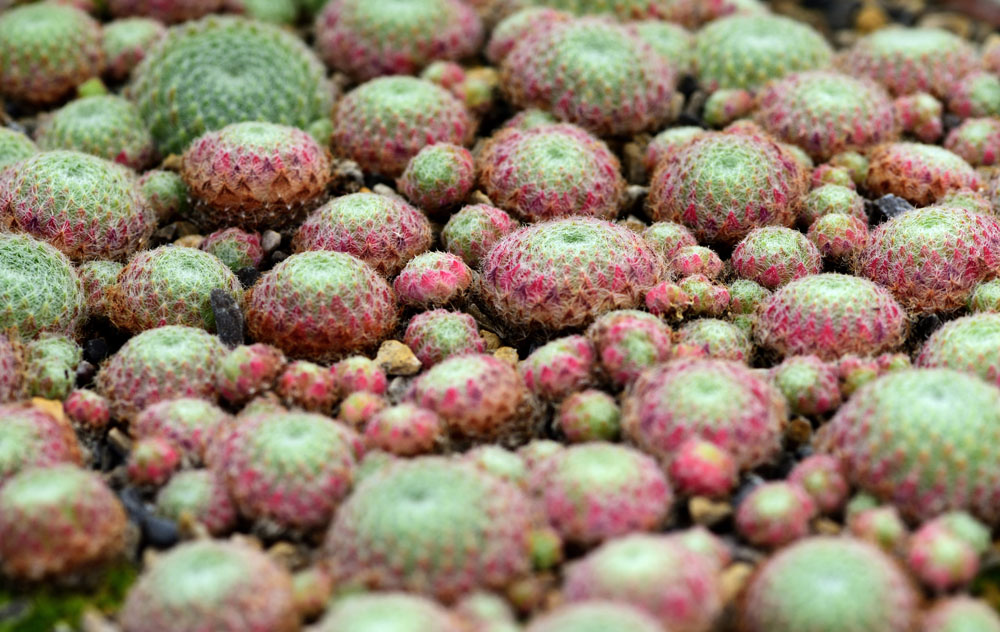 There are 40 dense, mat forming, evergreen succulent perennial in the Crassulaceae family, in this genus. They are found naturally occurring in the mountains Europe and Western Asia. They bear monocarpic rosettes of thick, pointed leaves, often with bristle fringed edges, and covered with web of white hairs. Flat, branching terminal, panicle like cymes of hermaphrodite star shaped, white, yellow, red, or purple flowers are borne upright stems in summer. The rosettes die after flowering, but are replaced by new, offset rosettes, borne in lateral runners. Numerous cultivars are available.. Grow in a rock garden, scree bed, wall crevice, or trough.