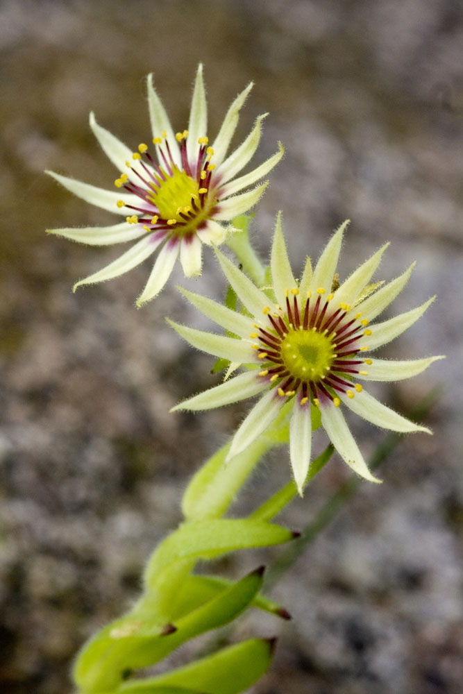 There are 40 dense, mat forming, evergreen succulent perennial in the Crassulaceae family, in this genus. They are found naturally occurring in the mountains Europe and Western Asia. They bear monocarpic rosettes of thick, pointed leaves, often with bristle fringed edges, and covered with web of white hairs. Flat, branching terminal, panicle like cymes of hermaphrodite star shaped, white, yellow, red, or purple flowers are borne upright stems in summer. The rosettes die after flowering, but are replaced by new, offset rosettes, borne in lateral runners. Numerous cultivars are available.. Grow in a rock garden, scree bed, wall crevice, or trough.