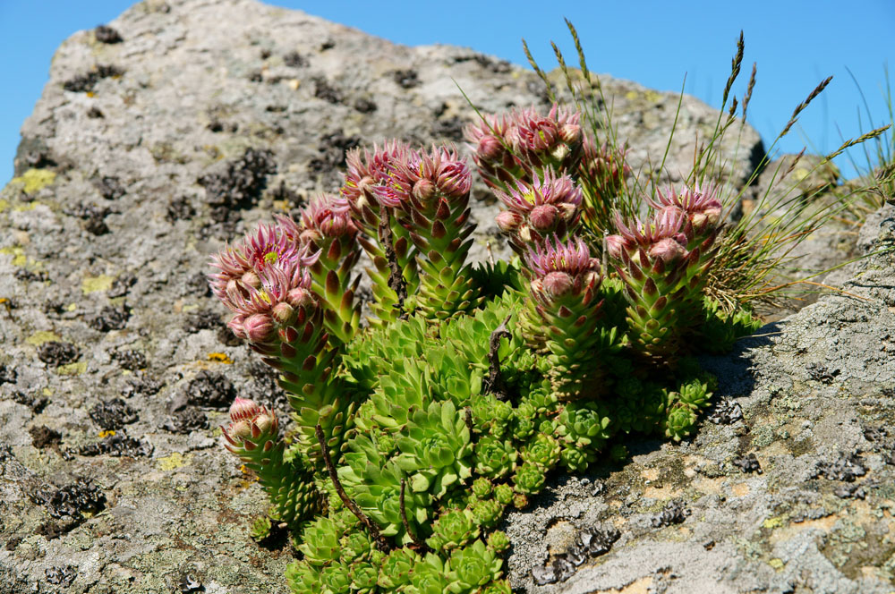 There are 40 dense, mat forming, evergreen succulent perennial in the Crassulaceae family, in this genus. They are found naturally occurring in the mountains Europe and Western Asia. They bear monocarpic rosettes of thick, pointed leaves, often with bristle fringed edges, and covered with web of white hairs. Flat, branching terminal, panicle like cymes of hermaphrodite star shaped, white, yellow, red, or purple flowers are borne upright stems in summer. The rosettes die after flowering, but are replaced by new, offset rosettes, borne in lateral runners. Numerous cultivars are available.. Grow in a rock garden, scree bed, wall crevice, or trough.