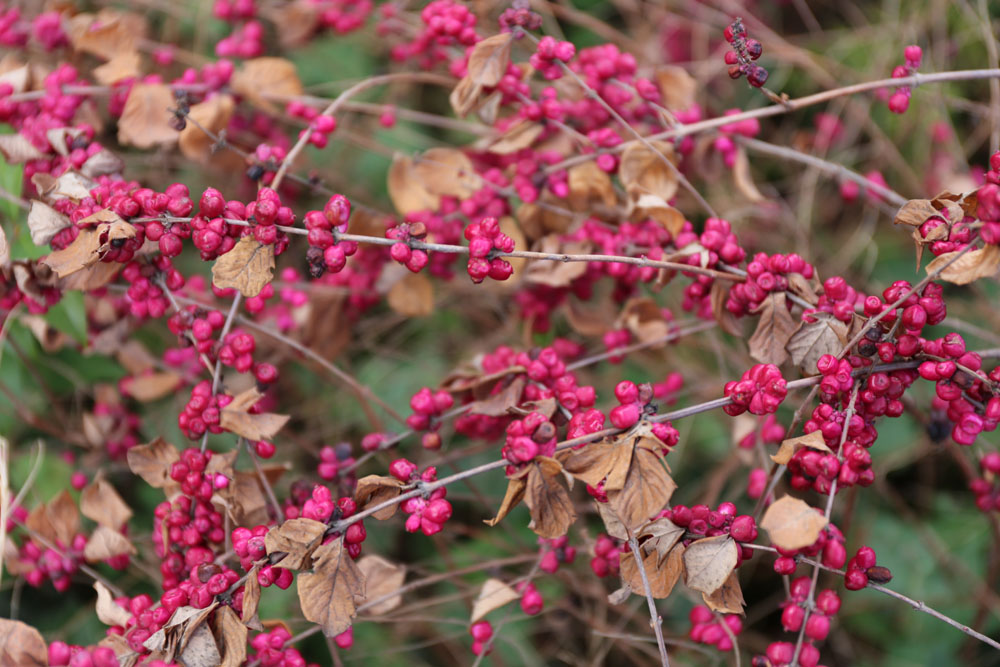 S. orbiculatus – Indian Currant – Buckbrush – Indian Currant Coralberry – This tough, adaptable dense, bushy shrub from Eastern USA and Mexico grows 6′ feet tall and wide. It produces broadly oval, downy dark green leaves, to 1 ½” long, which develop red tints in autumn. In late summer and early autumn, bears dense clusters of tiny, bell shaped, white, sometimes pink tinged flowers, followed by an abundant ovoid-spherical, dark purple-red fruit, to 1/4″ across.