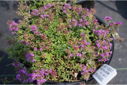 T. polytrichus – T. ‘Porlock’- T. praecox- Creeping Thyme- Wild Thyme – This dense evergreen, creeping perennial from South Europe grows ½”-2″ tall and can spread to more than 24″ wide. From woody, prostrate, branching stems it produces narrowly oval to oblong, aromatic, dark green leaves, 3/8″ long, fringed with minute hairs. In summer it bears mauve, purple , occasionally off white flowers in clusters.