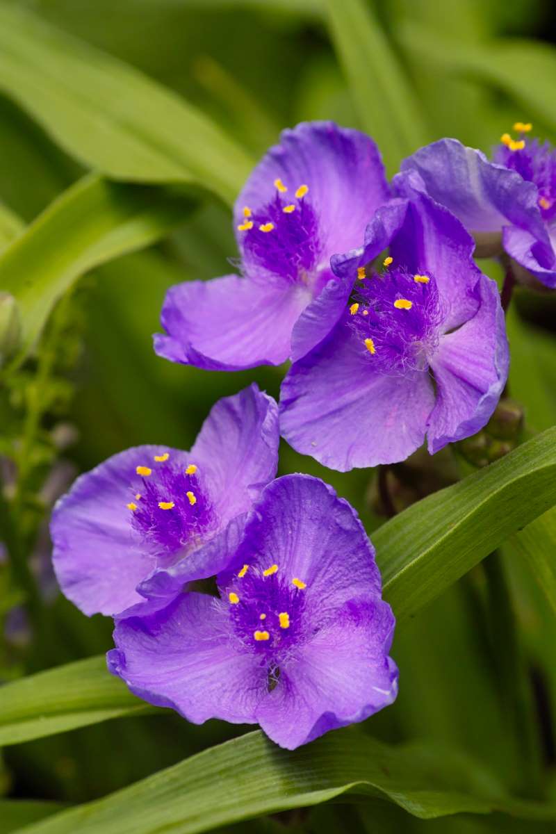 There are about 71 creeping, trailing, or tuft forming, fibrous or tuberous rooted, evergreen perennial, in the Commelinaceae family, in this genus. They naturally occur in woodlands, scrub, or disturbed ground from Canada south to Northern Argentina. The leaves are alternate, usually fleshy, blade like to lanceolate shaped, often purple flushed or variegated, and hairy or hairless. Short live, spreading, usually saucer shaped flowers, each 3 petals and 3 sepals and 6 yellow anthers are produced in terminal or axillary cymes, which are fused in pairs, with paired, boat shaped bracts, in late summer. The flowers are white, pink or purple but most commonly bright blue some of which open in late morning and close by night. Hardy Tradescantias are suitable for a mixed or herbaceous border. Contact with the foliage may irritate skin.