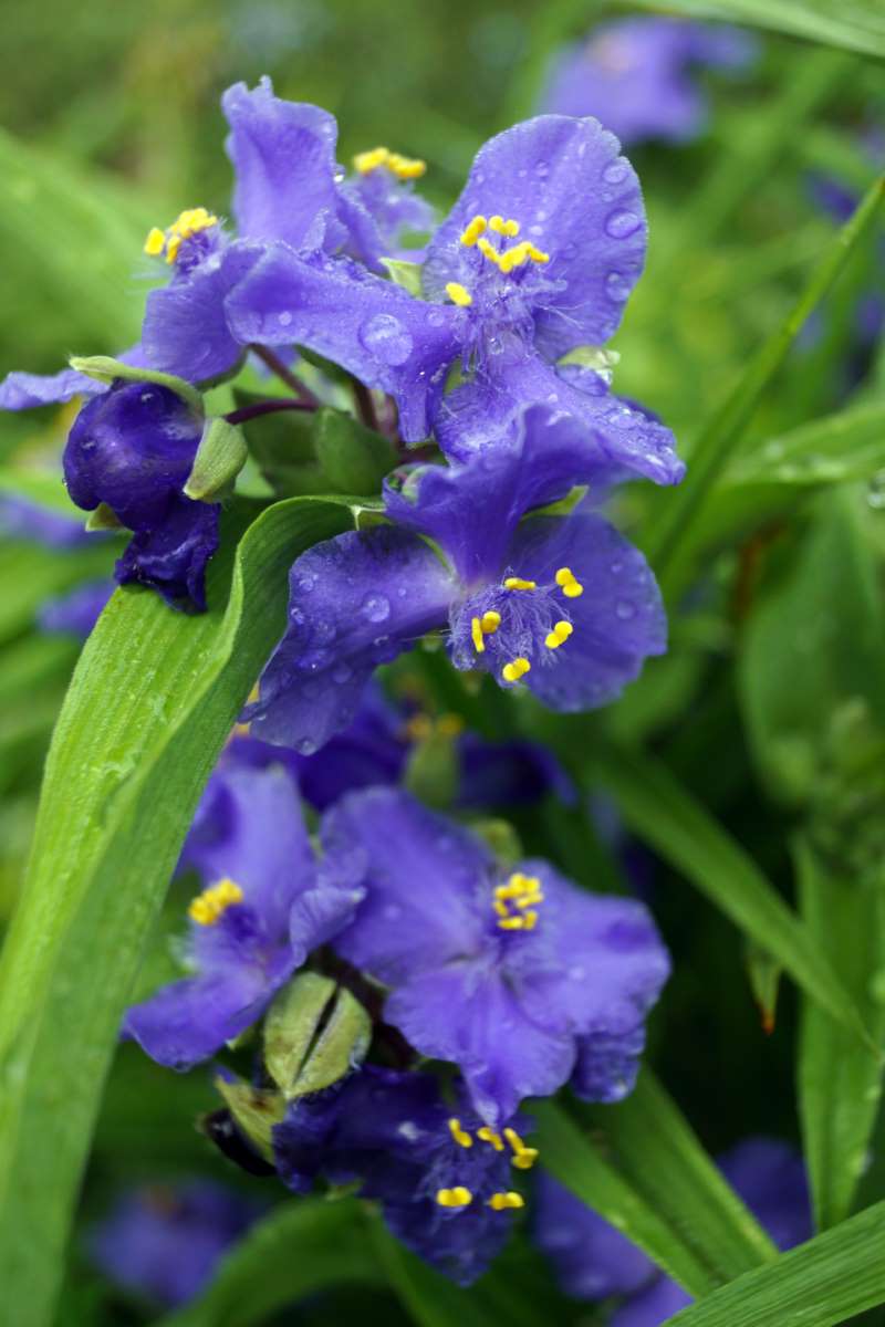 There are about 71 creeping, trailing, or tuft forming, fibrous or tuberous rooted, evergreen perennial, in the Commelinaceae family, in this genus. They naturally occur in woodlands, scrub, or disturbed ground from Canada south to Northern Argentina. The leaves are alternate, usually fleshy, blade like to lanceolate shaped, often purple flushed or variegated, and hairy or hairless. Short live, spreading, usually saucer shaped flowers, each 3 petals and 3 sepals and 6 yellow anthers are produced in terminal or axillary cymes, which are fused in pairs, with paired, boat shaped bracts, in late summer. The flowers are white, pink or purple but most commonly bright blue some of which open in late morning and close by night. Hardy Tradescantias are suitable for a mixed or herbaceous border. Contact with the foliage may irritate skin.