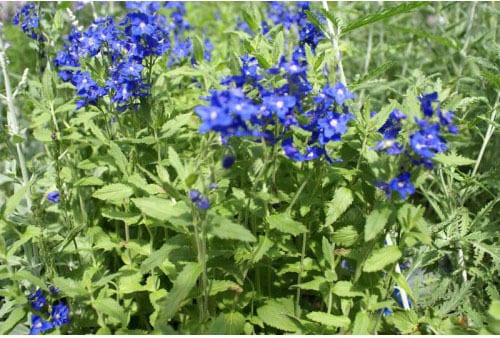 V. austriaca subsp. teucrium – V. teucrium – This clump forming perennial from North temperate areas of Europe and Asia, grows 18-36” tall and 24” wide. It produces broadly oval to oblong, scalloped or deeply toothed, hairy, grayish green leaves, to 3” long. Over a long period in summer, it bears abundant, upright spike like racemes, 4-6” long of saucer shaped true blue flowers.