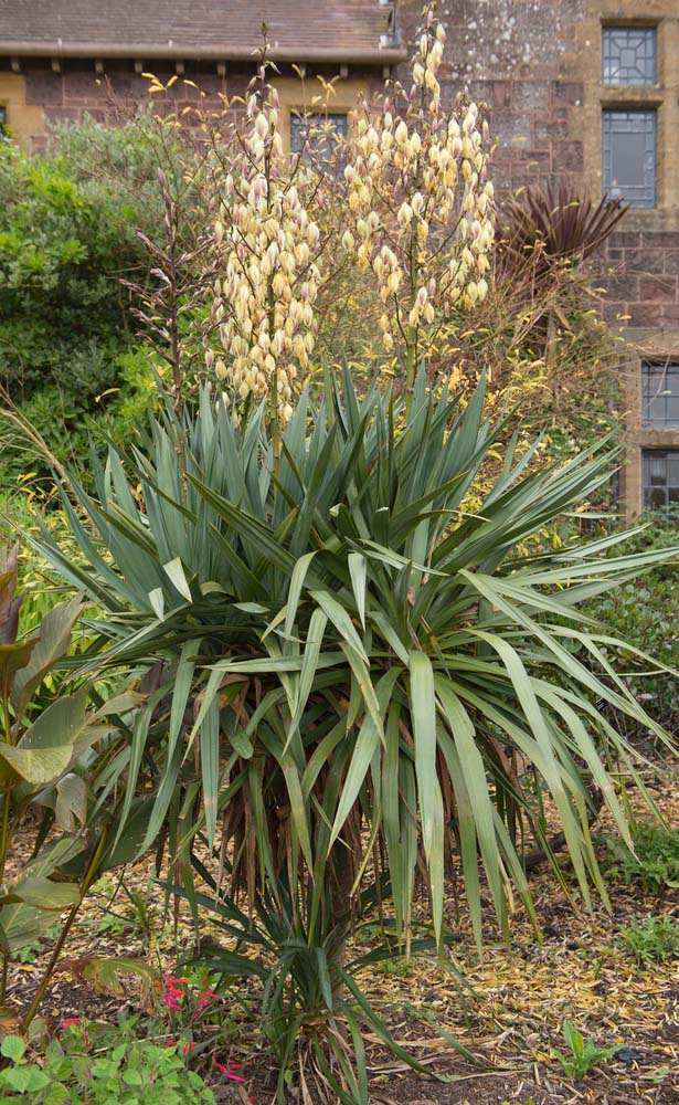 Y. recurvifolia – Y pendula – Weeping Yucca – This robust, tree like shrub, from southeast USA, grows 5-10’ feet tall and 4-8’ feet wide. It produces lance shaped stiffly leathery, mid to deep green leaves to 36” long, with smooth or slightly toothed edges, the leaves often bend and droop at the tips. Pendent, bell shaped creamy white flowers, up to 3½” long open in upright panicles, to 6’ long, from late summer to late autumn.